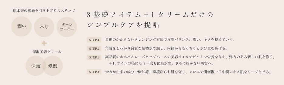 保湿力、保水力、再生力、代謝機能、バリア機能が整うお肌へ ストレス、ダメージを受けた肌は、お肌をやさしくいたわりながら健やかなお肌に。