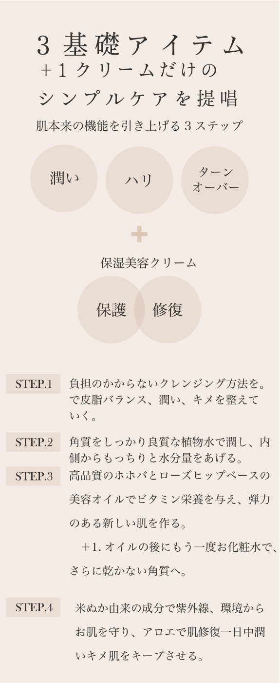 余分なものをできるだけ排除し、植物自身が育んだビタミン、ミネラル、紫外線や乾燥、外界から守る力強い成分は私たちのストレスフルなお肌を健康で強く、理想的な肌の生まれ変わりが日々更新されます。